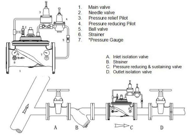 維持用戶端管道的壓力;當(dāng)管道壓力超過設(shè)定值時(shí),閥門自動(dòng)打開,把多余的壓力釋放到下游;當(dāng)管道壓力低于設(shè)定值時(shí),閥門關(guān)閉;