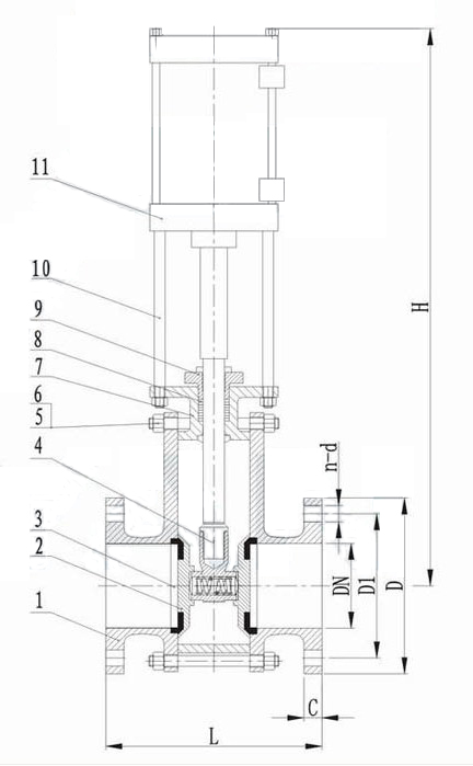 當(dāng)氣缸通過(guò)閥桿帶動(dòng)閘板下行時(shí),閘板與閥體密封面吻合,將通道切斷,即為關(guān)閉;反之則為開(kāi)啟。
